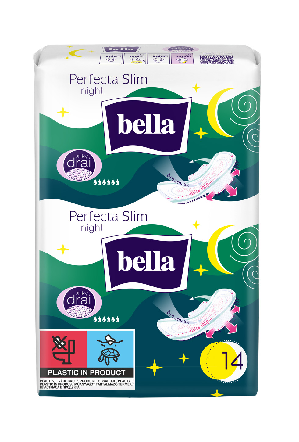 Hygienické vložky Bella Perfecta Night sú ultratenké (2mm) so zvýšenou savosťou určené špeciálne na noc. Vysokú ochranu zabezpečuje výnimočná dĺžka až 315 mm. Taktiež sa odporúčajú ženám so silným krvácaním. Vonkajšia vrstva je pokrytá priedušnou fóliou, ktorá chráni spodnú bielizeň a zároveň umožňuje pokožke dýchať. Vnútorná vrstva je vyrobená z jemnej sieťky SILKY DRAI. Maximálnu ochranu zaisťuje absorpčné jadro neutralizujúce intímnu vôňu. Stabilná lepiaca páska a bočné krídelká zabraňujú posúvaniu vložky. Jednotlivo balené vložky poskytujú diskrétne použitie v cestovaní, práci, v škole.