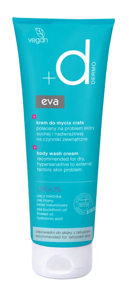Eva Dermo krémový sprchový gél je určený na suchú pokožku. Dokonale čistí a zároveň sa stará o suchú a citlivú pokožku tela. Je bohatý na rakytníkový, ľanový a olivový olej, intenzívne premasťuje a vyživuje pokožku a zanecháva na nej balzamový efekt. Synergická kombinácia kyseliny hyalurónovej a močoviny poskytuje hĺbkovú hydratáciu a zjemňuje epidermis. Prídavok alantoínu, extraktu z bodliaka a ázijskej bazalky má upokojujúci účinok a podporuje proces regenerácie. Po použití čistiaceho krému získava pleť zdravý vzhľad. Vhodné na každodennú starostlivosť o zahojenú pokožku s tetovaním. Vhodné pre vegánov.